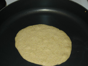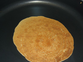 Blend till smooth and pour onto a med/hot griddle, shaking pan to distribute evenly into a thin crepe/pancake for approx 1 1/2 minutes on each side | |||