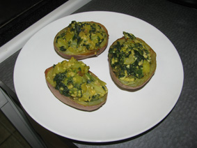 Pour the above cashew cream over 2 c steamed spinach and the chopped potatoes. Mix well.